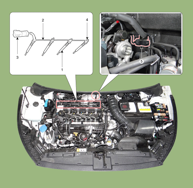 1. Bougie de préchauffage 2. Plaque de relais de préchauffage 3. Connecteur de la bougie de préchauffage |